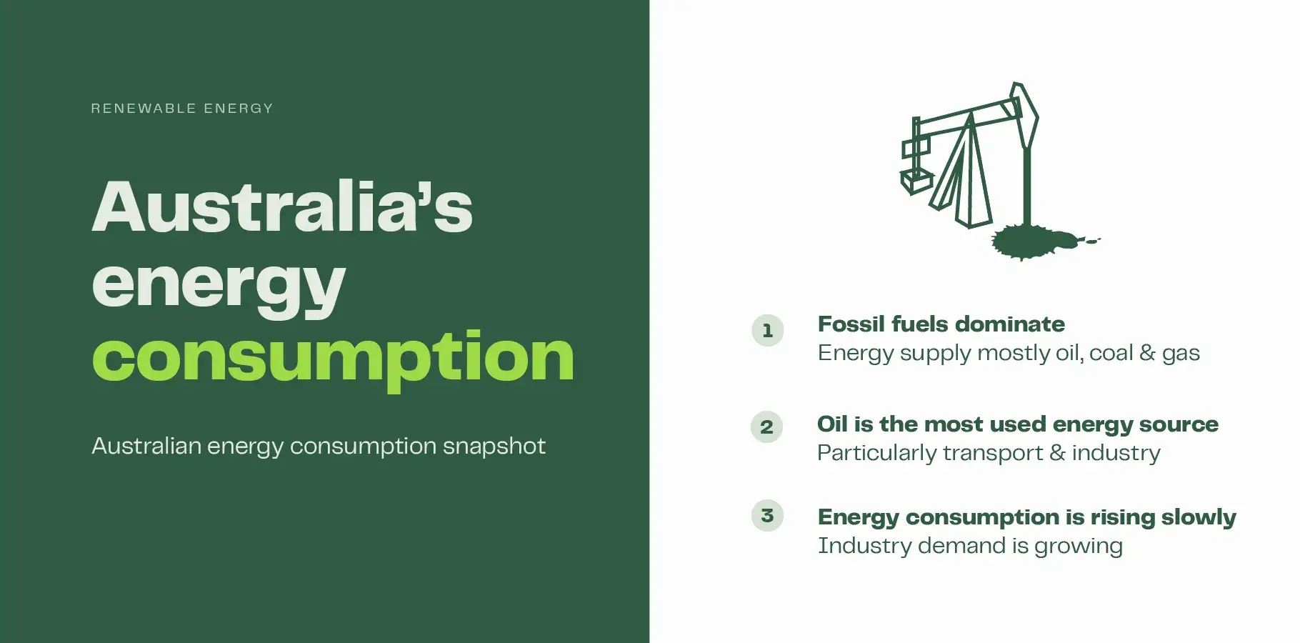 Despite the numerous advantages of renewable energy, it accounts for less than 10% 6 of Australia’s total energy consumption. Whilst renewables are continuing to grow, Australia’s transport and industrial industries still rely heavily on fossil fuels, which keeps renewable consumption relatively low despite strong growth in production.