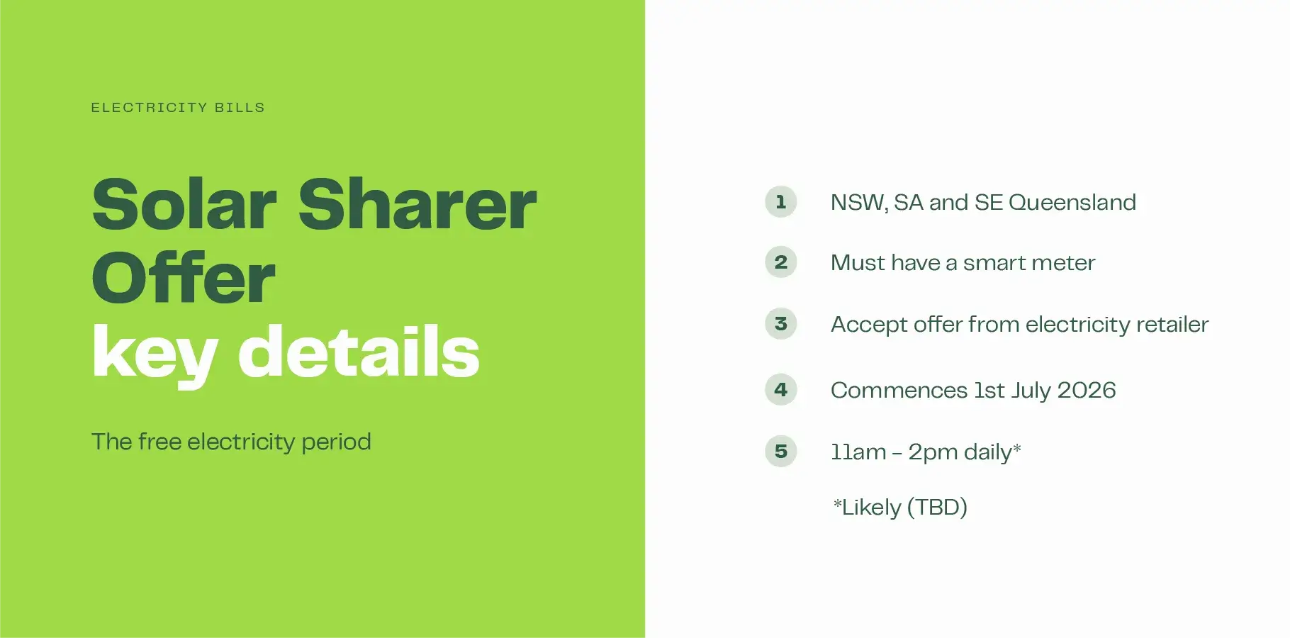 The Solar Sharer Offer is an initiative proposed by the Australian government whereby households from eligible states with a smart meter can access free electricity for a 3-hour window during the middle hours of the day.