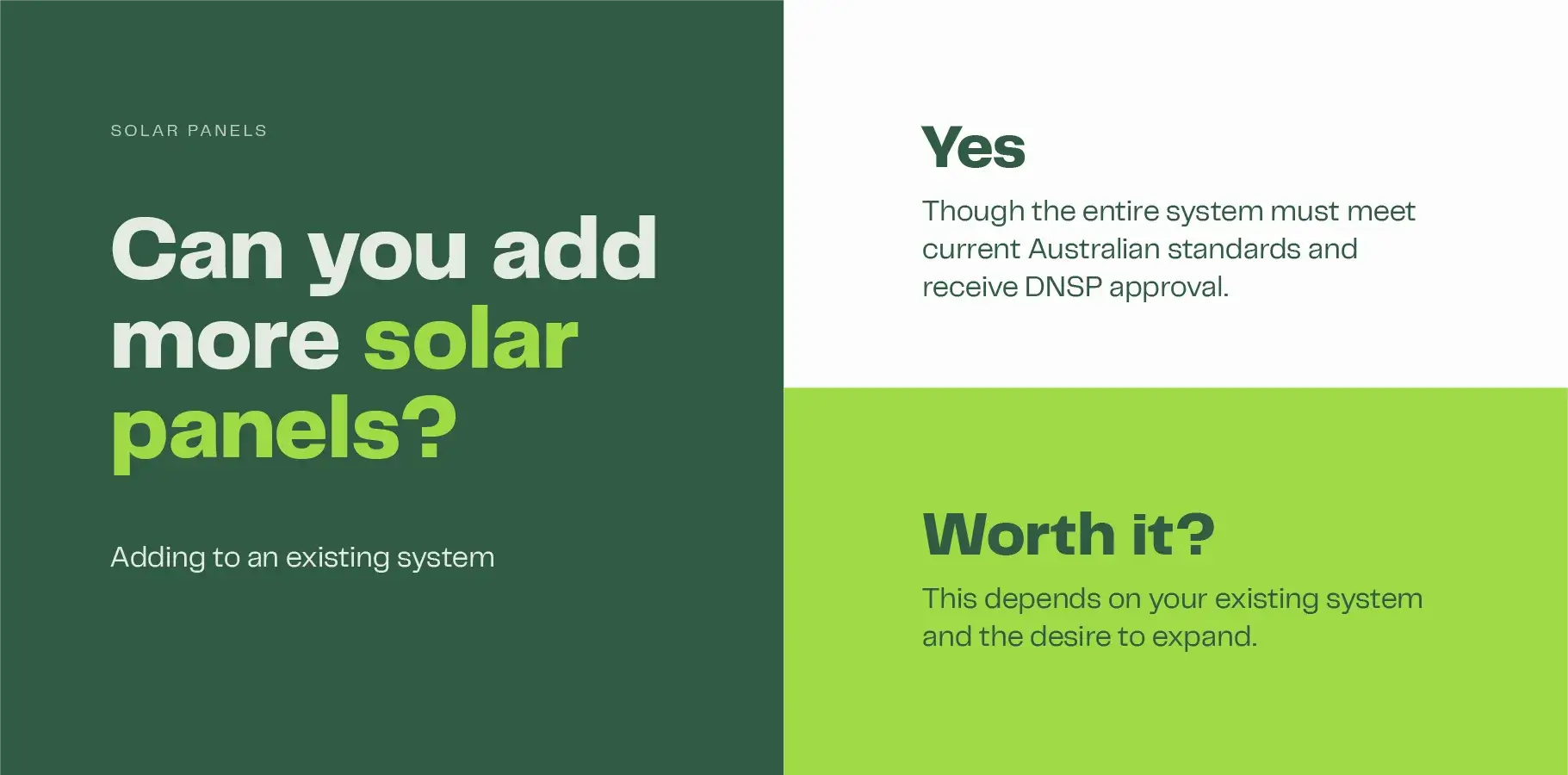When adding more panels to an existing system, you must be granted permission from your Distribution Network Service Provider (DNSP). They will determine if your planned modifications meet their inverter sizing and export limits.